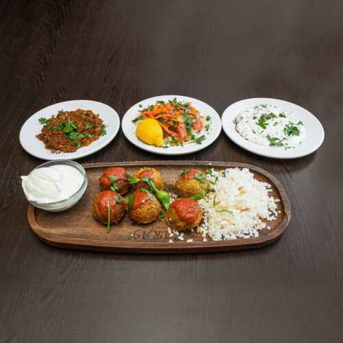 mit gebratenem Gemüse, Falafel, Sigara Börek und Naturjoghurt